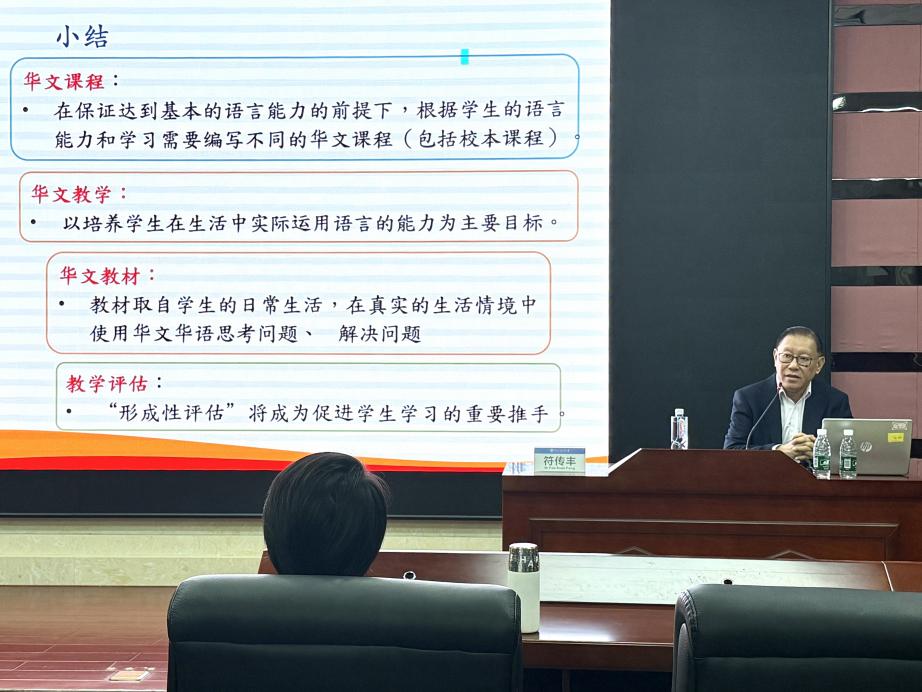讲座伊始,符传丰院长以生动翔实的内容,介绍了新加坡的“多语种、多文化”的社会环境,进而引出当前全球传播背景下新加坡华文教育面临的新形势与新方向。他强调,新加坡的华文传播正在深度落实“乐学善用”理念,并围绕四个层面展开深入阐述。在课程层面,符传丰院长提出课程规划要主张实施灵活的课程分流机制,在课程结构上强调校本课程的功能定位;在教学层面,他倡导传播活动应重视本土生活资源,并积极融合信息技术优化教学手段;在文本层面,需立足不同文化背景的信息接受者视角,实现语言文化和生活实践的有机衔接;在评估层面,应重视“形成性评估”方面,使文化浸染成为促进信息接受者兴趣持续的重要推手。讲座的最后,符传丰院长表明,新加坡的华文传播需要从国际政治与社会经济的宏观角度来考量,从而确定具体的传播策略,让华文继续在下一代国民的教育过程中发挥作用,进而对国家的文化认同、社会建设与经济发展作贡献。