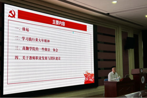 会议第一部分为第四批“全国高校黄大年式教师团队”——广外翻译教师团队代表作专题分享。太阳成tyc7111cc高翻学院党委书记李和民从“缘起”、“学习践行黄大年精神”、“高翻学院的做法与体会”、“关于教师职业发展与团队建设”四个方面展开分享,他强调要通过“有组织的科研”实现合作共济,学院也需要给予支持,营造良好氛围助力教师成长与团队建设。